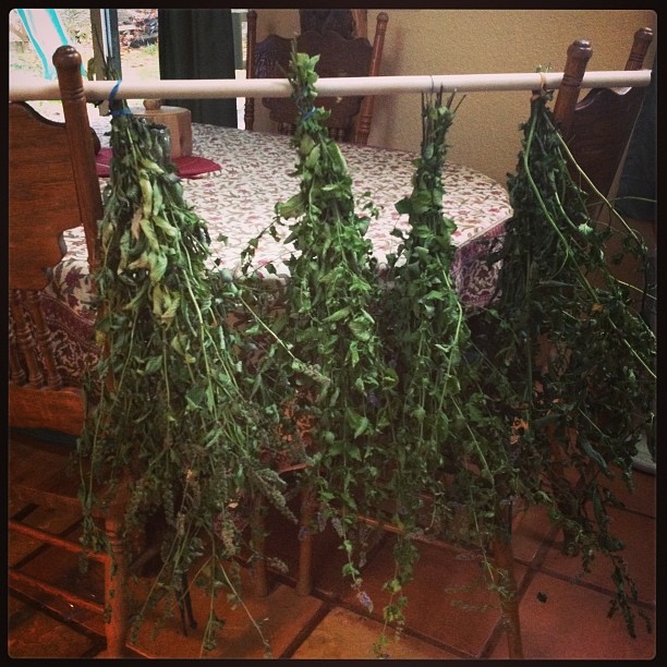 And what do I do with all that mint? Well, aside from kneeling down and inhaling giant whiff-fuls on an almost daily basis throughout the summer, I wait for the first chill to signal the coming of fall, and then I cut down big bundles of mint, capture them in rubber bands, and bring them inside to dry. Because winter’s coming, you know, and there should really be tea.